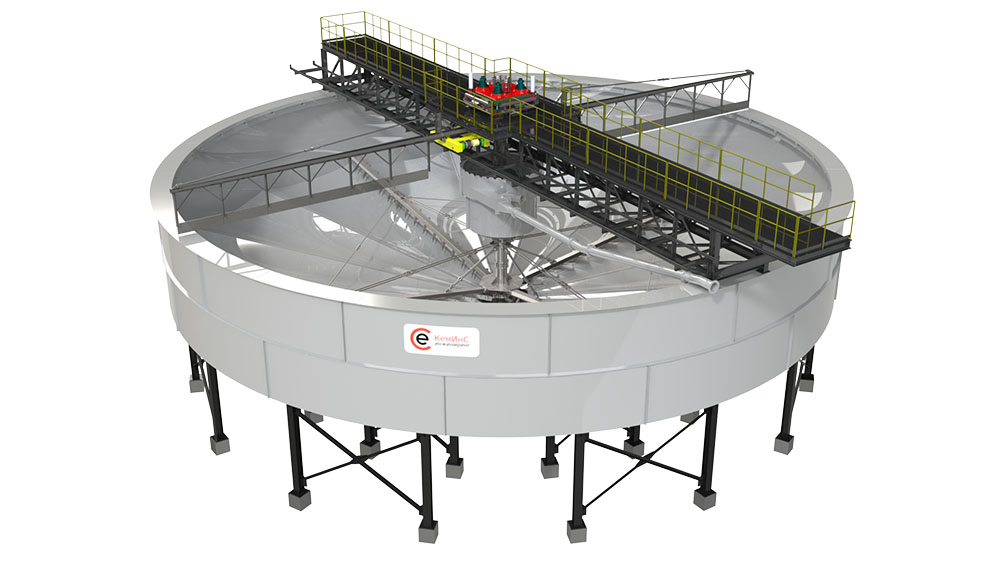 Сгуститель состоит из чана круглого сечения с опорной конструкцией, моста с центральным приводом, питающего колодца, системы граблин, системы дозирования флокулянта, системы пеноулавливания, насосов отведения сгущеного продукта. Для наружного размещения сгуститель также оснащается полноразмерной крышкой, термической изоляцией, отапливаемым помещением над центральным приводым механизмом.