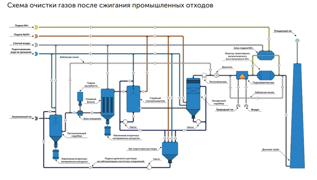 Следующим аппаратом мокрой очистки является насадочный скруббер, где происходит абсорбция загрязняющих веществ из газовой фазы орошающим раствором. Потом газ подогревается в теплообменнике и направляется в камеру дожига, после чего проходит