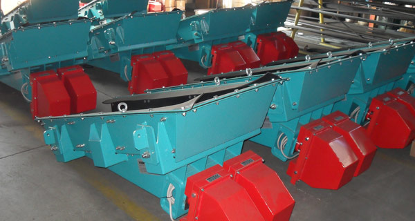 Электромагнитные вибрационные питатели приводятся в движение одним электромагнитным двигателем, расположенным под транспортным жёлобом.